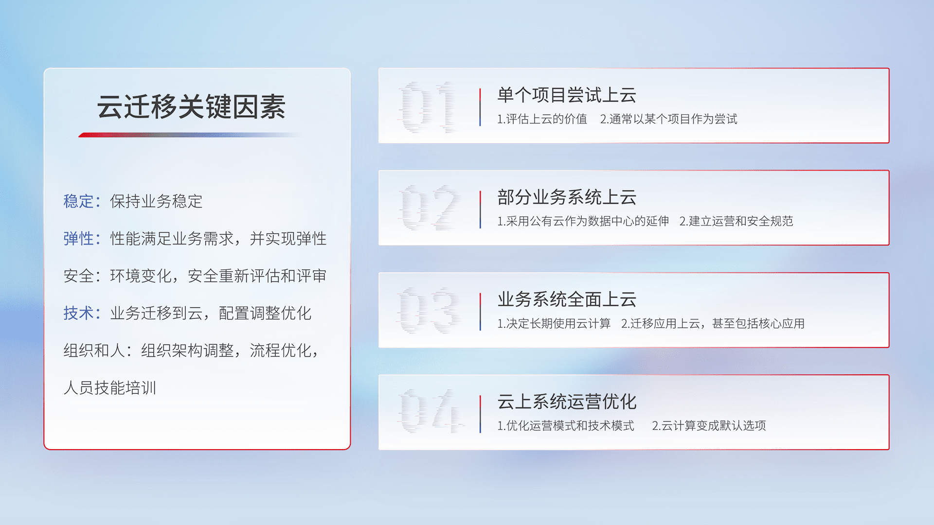 结合实际业务,,,从规划设计、、、云平台选型、、云原生改造、、数据迁移、、、集成交付,,迁移全过程为客户识别最佳上云路径,,,,做好风险识别管理,,设计网络架构、、、、身份权限、、、、安全审计合规、、、操作审计、、、、日志审计、、、监控告警策略、、、、多站点容灾设计等,,对云上基础设施进行整体规划,,,,提升IT治理水平,,以满足弹性、、、高可用、、、高性能的需求。。。。