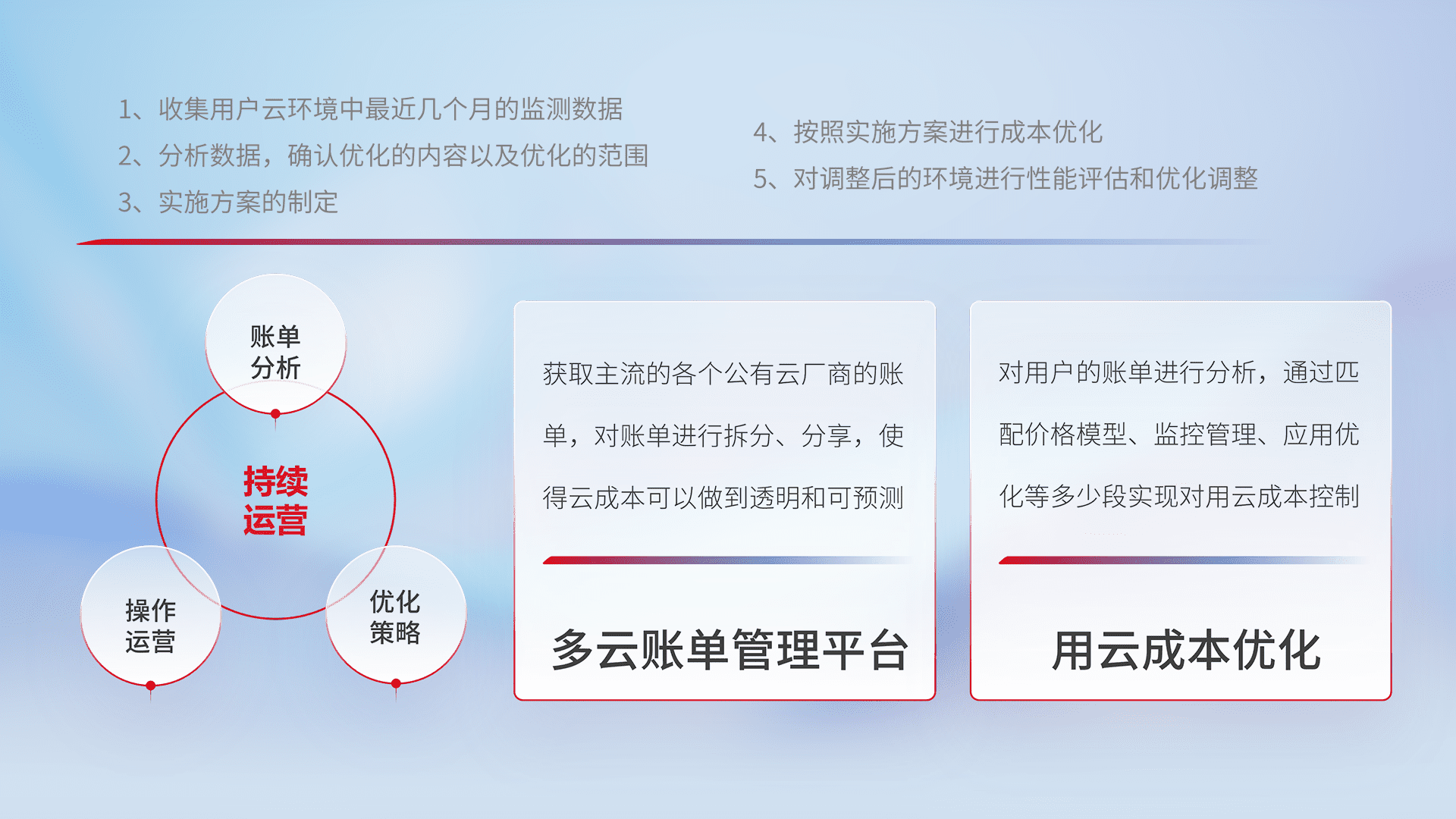 通过多云纳管,,,以统一的资源数据模型把客户的云资源进行抽象和封装,,,进而实现对多云资源的统一操作,,,保障云资源管理的可靠性、、、稳定性与可用性。。量身定制化运维内容,,配置、、、、开发运维、、补丁管理、、备份、、、、监控、、认证和访问管理、、、审计和日常巡检等,,,保障在用云过程中的可靠度,,,稳定度以及高可用率。。。